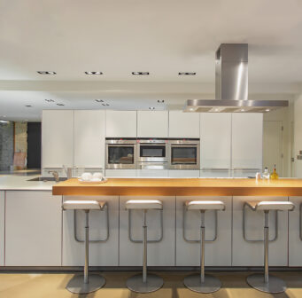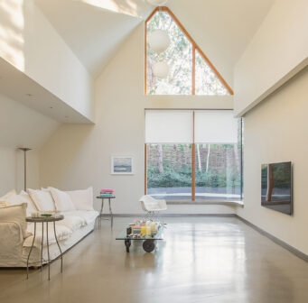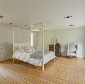 The main living area occupies the ground floor of the stone ‘barn’, accommodating the kitchen and main living area. These areas then lead into other living areas such as the formal dining area and family areas. Constant reference to the site and its landscape are available through glazed openings. A cantilevered stair leads to the two main bedrooms occupying the first-floor level. These bedrooms are oriented east/west and take advantage of the gables of the main ‘barn’ element to provide excellent views out to the landscape.