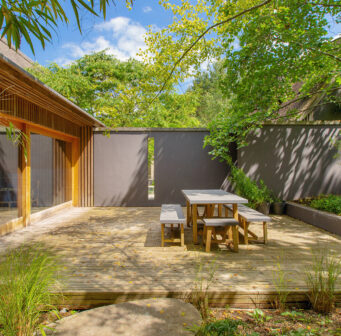 Deep overhanging eaves allow for the use of the garden and landscaped areas for much of the year. By having the buildings seemingly extend beyond one’s vision a level of comfort is given internally, and also ensures the buildings do not dominate the site by having large areas of vertical walling.
