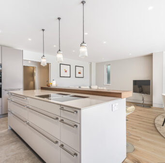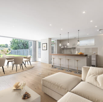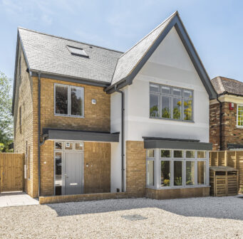 The modern five-bedroomed dwelling has a simple rectangular form, with projecting gables to the front and rear. At the rear a large kitchen, dining and living space has a complete wall of openable glazing with easy access to the south-facing garden. The bedrooms are accommodated on the first floor and within the roof space to maintain the outward two-storey appearance from the road.