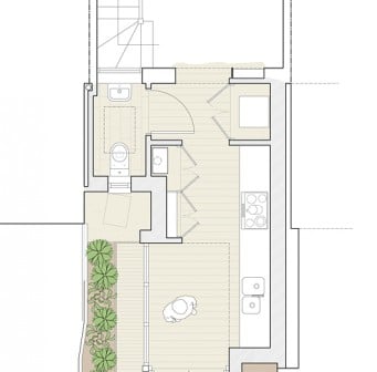By moving the cloakroom we have allowed the kitchen to flow from the dining area towards the garden, ending with a glazed screen that opens upwards and outwards. The amount of natural light is increased substantially, views of the rear garden are revealed and access to the garden is easy.