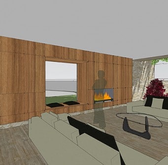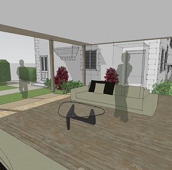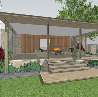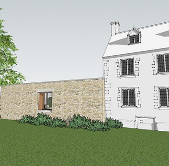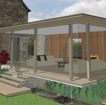 The idea of a lightweight pavilion that was gently touching the Manor house was envisaged. The pavilion would be anchored to the site with a think stone wall to the north, replacing a portion of the Yew hedging. A large opening would frame views across the valley and offer a glimpse of the church. From the south it would appear to float over the existing rill and be fully glazed to maximise light penetration in the latter parts of the day; the time when the space would be used the most.