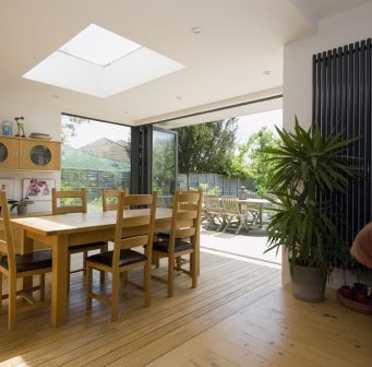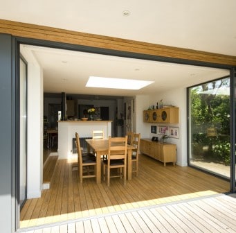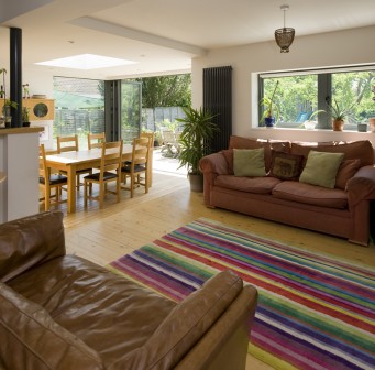 Further discussions with our clients revealed they wanted easier access to their south facing garden; the existing house had French doors out on to a concrete patio and their small children found negotiating the steep steps out of the house difficult. The change in level from the main house into the garden was an advantage that we exploited in the design; the dining area was set at garden level, with shallow steps down from the kitchen and family living areas. These steps helped define the dining area and allowed a higher ceiling height than the main house, thus giving the occupants a real sense of occasion when dining (or finger painting). Unobstructed views from the kitchen over the dining table into the garden are also achieved. An external timber deck was set at the same height as the new floor level and with full height glazed sliding/folding doors to the dining area, easy access to the garden is now possible. The large areas of glazing help bounce light into the interior of the house and large overhangs to the roof allow the doors to be open even when the weather is less than sunny.