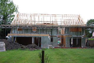 Have just received an update from a client on progress of their new house. The house incorporates a timber frame which has been made in a factory prior to erection. The frame has gone up in ten days and it’s great to see the form of the property at such an early stage.